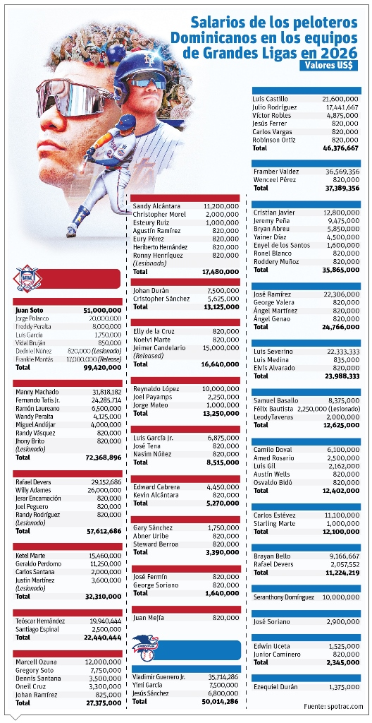 El jugador mejor pagado entre los dominicanos es el jardinero Juan Soto, de los Mets, quien tendrá salario por US$51 millones, cifra récord para el país.