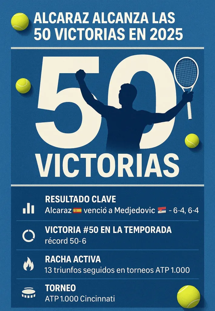 En cualquier caso, Alcaraz consiguió en otra tarde de muchísimo calor en Cincinnati su victoria número 50 de la temporada con un balance total de 50-6. También lleva 13 triunfos consecutivos en los ATP 1.000 después de sus títulos en Montecarlo y Roma.