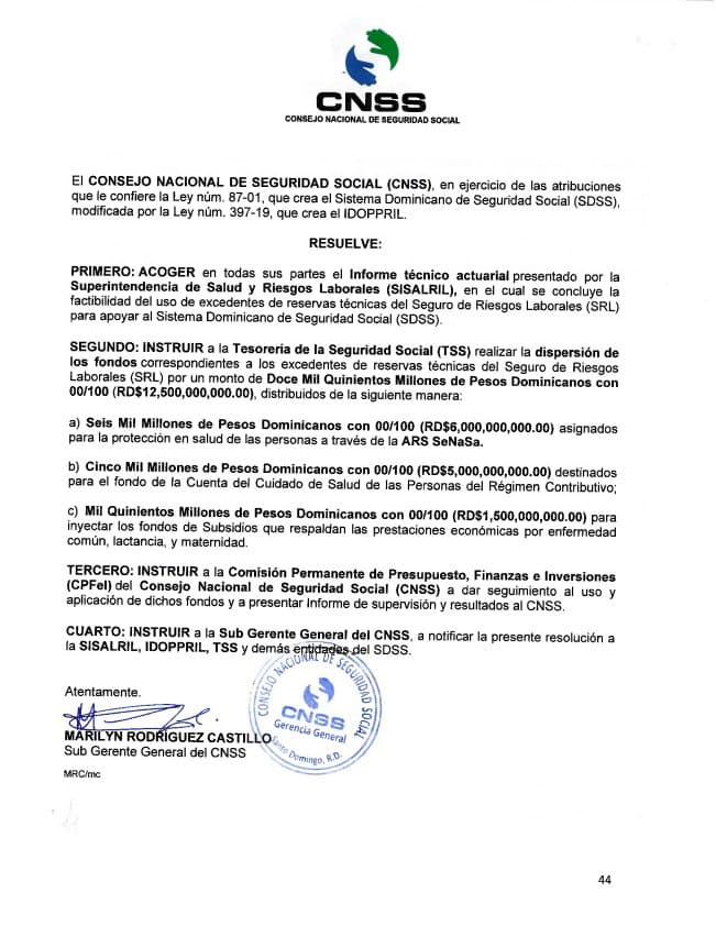 El documento, firmado por la subgerente general del CNSS, Marilyn Rodríguez Castillo, señala que la decisión se adoptó tras acoger el informe técnico-actuarial presentado por la Superintendencia de Salud y Riesgos Laborales (Sisalril), que avaló la factibilidad del uso de los excedentes.