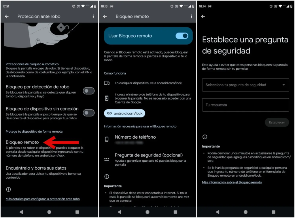 Una vez allí, debes ingresar en Bloqueo remoto para completar una muy breve configuración. En la siguiente pantalla solo tienes que activar la función, aunque también puedes establecer una pregunta de seguridad como medida de protección adicional. Esto último es opcional, pero te recomendamos implementarla. Así te evitarás que cualquiera que conozca tu número de línea celular se haga el chistoso y te bloquee la pantalla a distancia.