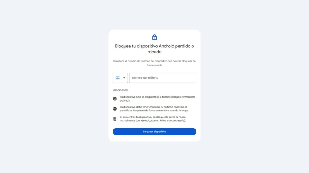 El bloqueo remoto de la pantalla de Android es una herramienta tremendamente útil de la que mucha gente desconoce su existencia. Esta permite ingresar al navegador desde cualquier PC o dispositivo y ejecutar la acción solo con el número telefónico del aparato perdido o robado. No es necesario entrar a tu cuenta de Google, ni nada por el estilo.