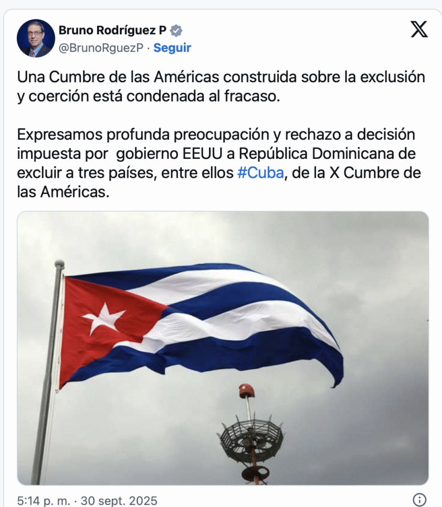 “Expresamos profunda preocupación y rechazo a la decisión impuesta por el Gobierno de EEUU a República Dominicana de excluir a tres países, entre ellos Cuba, de la X Cumbre de las Américas”, escribió el ministro de Exteriores de la isla más grande del Caribe.