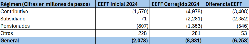 Los pasivos de SENASA duplican los activos. SENASA cerró 2024 con capital NEGATIVO de RD$14,538 millones. Esta situación es lamentable y no se justifica salvo que no haya un fraude colosal. Si se quieren ver el cambio entre los estados financieros de 2024 iniciales y corregidos, debajo incluyo una tabla. El régimen Contributivo tiene un déficit de casi cinco mil millones de pesos y el subsidiado de casi 2,300 millones de pesos. Son cifras increíbles, pero no incluyen los gastos de años anteriores (RD$15,488 millones adicionales).