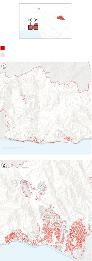 Más de 4.400 edificaciones resultaron dañadas o destruidas en las áreas de Pacific Palisades y el este de Malibu hasta el 9 de enero, según un análisis de imágenes satelitales realizado por la Universidad Municipal de Nueva York (CUNY) y la Universidad Estatal de Oregón. Mientras las evaluaciones de daños continúan, Cal Fire estima que aproximadamente hasta el lunes 5.000 estructuras fueron dañadas o destruidas.
