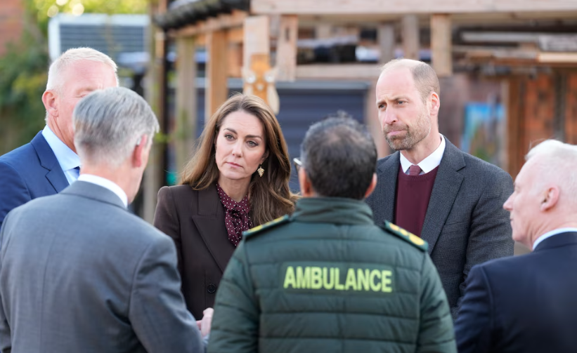 Guillermo y Kate hablan con miembros de los servicios de emergencia durante una visita al Centro Comunitario de Southport. (Danny Lawson, Pool Photo vía AP)
