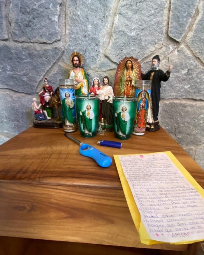 En el interior, sobre un buró de madera, se observan veladoras con imágenes de San Judas Tadeo,conocido como santo de las causas imposibles; San Charbel, o santo de los milagros, a quien atribuyen el don de la curación o taumaturgia; la Virgen de Guadalupe, la Sagrada Familia y San Martín Caballero, patrono de los comerciantes; indicando hábitos de devoción recientes.