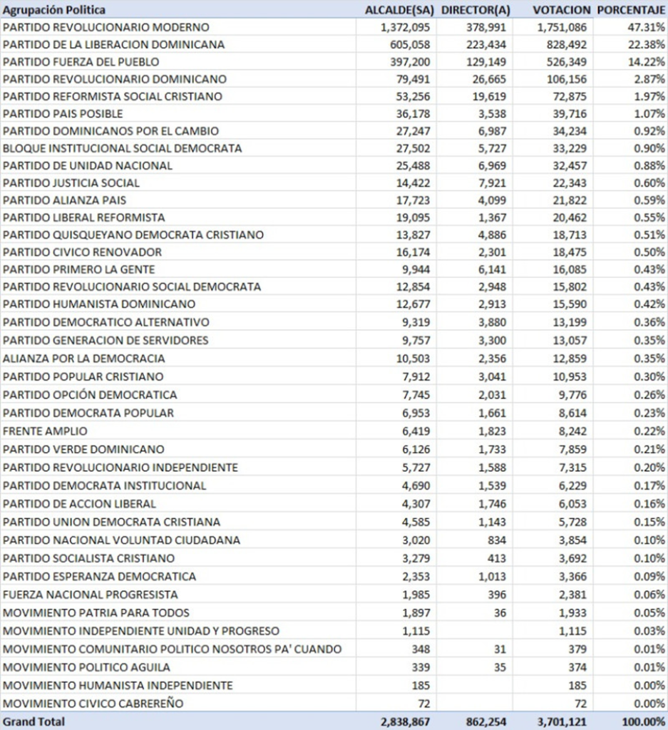 Relación de votos obtenidos por cada partido político en elecciones municipales de febrero 2024, en los nivele de alcaldía y directores (JCE)Relación de votos obtenidos por cada partido político en elecciones de febrero de 2024, en los niveles de regidores y vocales (JCE)
