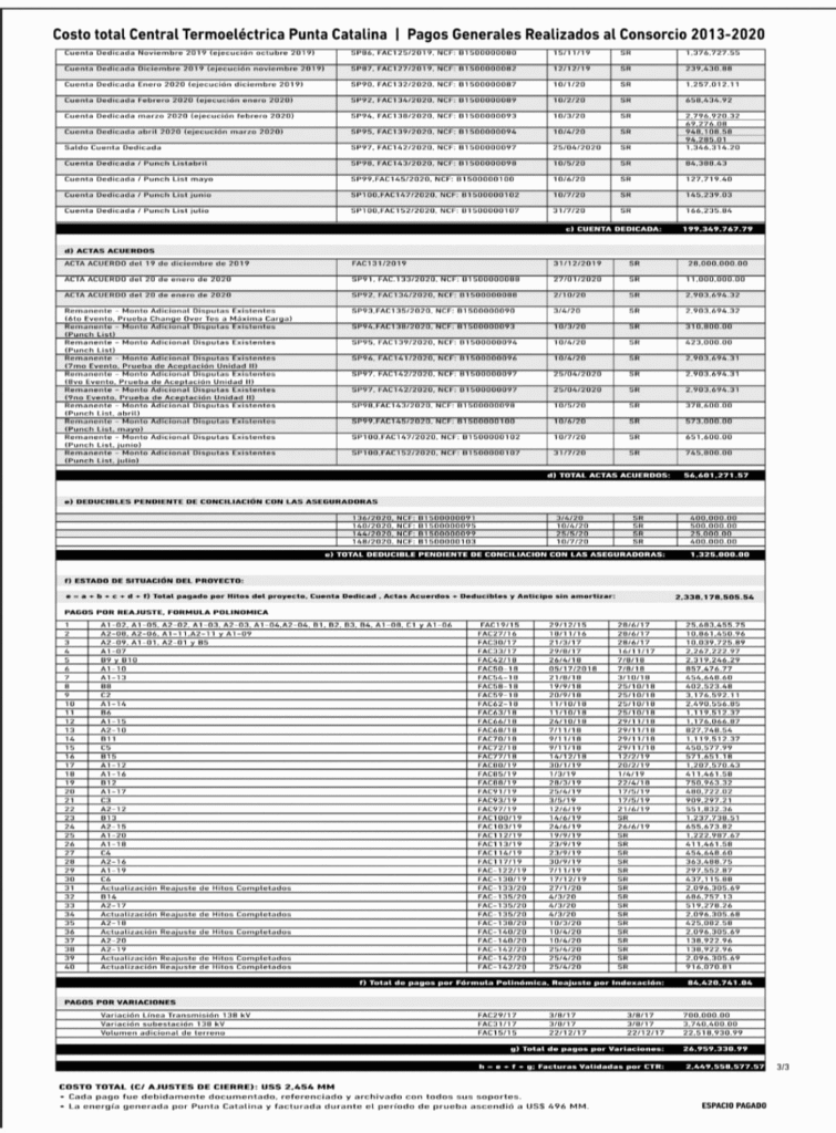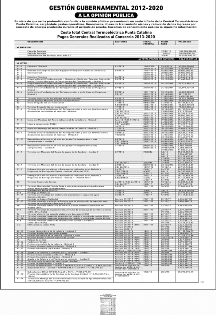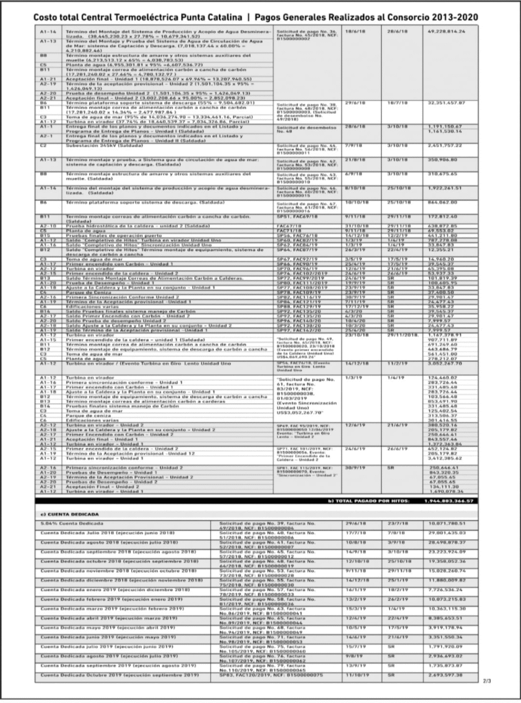 A continuación publicamos la documentación soporte del costo total de la Central Termoeléctrica Punta Catalina (CTPC), de pagos generales realizados y que fueron debidamente documentados, referenciados y archivados en la gestión gubernamental 2012-2020