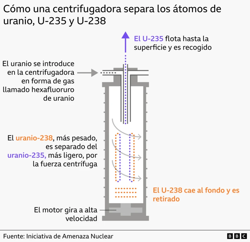 Esto permite separar gradualmente el U-235 —la forma más escasa y útil del uranio— del U-238, más común.