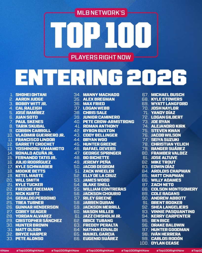 El japonés Shohei Ohtani repitió como el número uno de todo el listado en un top 5 que completan Aaron Judge, Bobby Witt Jr., y Cal Raleigh. Entre los latinoamericanos, Venezuela colocó siete jugadores, Cuba tres, Puerto Rico dos y Panamá uno.