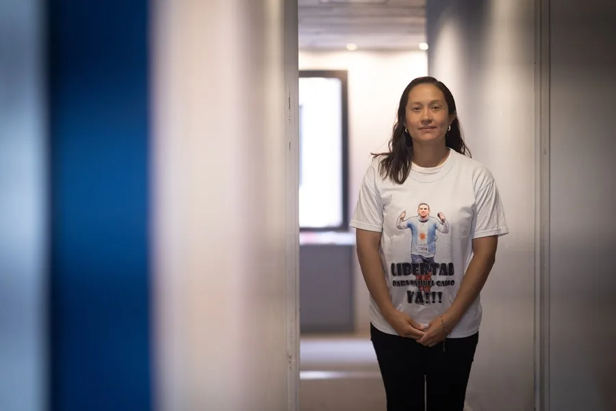 Fotografía de María Gómez con una camiseta con un mensaje que pide la liberación de su esposo, el argentino Nahuel Gallo, en Buenos Aires (Argentina). EFE/ Juan Ignacio Roncoroni