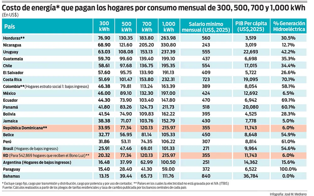 Los hogares que consumen 300 kWh al mes en Honduras (US$76.90), Nicaragua (US$68.90), Uruguay (US$63.03), Guatemala (US$59.70), Chile (US$58.61), El Salvador (US$57.60), Costa Rica (US$51.69), Colombia (US$46.38), México (US$46.00), Ecuador (US$44.30), Panamá (US$41.80), Bolivia (US$41.54) y Jamaica (US$38.38) pagan un cargo por energía mayor que el que paga ese hogar en República Dominicana (US$33.95). Si deducimos el aporte del Bono Luz, hay hogares dominicanos que consumen 300 kWh y terminan pagando un cargo efectivo por energía de US$20.32, por debajo de los cargos en Belice, Perú y Brasil. La situación se verifica también para los hogares que consumen 500 kWh, exceptuando los casos de Ecuador, Bolivia y Jamaica. Alguien podría indicar que, en Paraguay, un hogar que consume 300 kWh al mes paga apenas US$15.40 por cargo de energía, mucho menos que los US$20.32 con Bono Luz incluido que paga ese hogar aquí. No olvidemos, sin embargo, que mientras en Paraguay el 100% de la electricidad es generada por hidroeléctricas, aquí es apenas el 6%. Colombia, con 58.1% de generación hidroeléctrica, con un PIB per cápita (US$8,064) muy por debajo del nuestro (US$11,743) y un salario mínimo (US$389) muy próximo al nuestro (US$355), tiene un cargo de energía para hogares de bajos ingresos que consumen 300 kWh (US$46.38) equivalente a 2.3 veces el cargo nuestro con Bono Luz incluido (US$20.32). ¿Cuál es el precio por kWh de energía que las empresas distribuidoras centroamericanas cobran a los hogares que consumen 300 kWh al mes? 25.6 centavos de dólar por kWh en Honduras, 23.0 en Nicaragua, 19.9 en Guatemala, 19.2 en El Salvador y 17.3 en Costa Rica. Pensar que nosotros podemos evitar el colapso de las EDE cobrando apenas 11.3 centavos por dólar o menos por kWh a casi 2.5 millones de clientes activos que consumen 300 kWh o menos es una tomadura de pelo.
