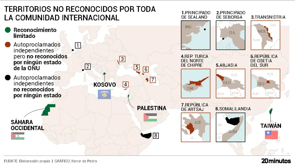 A estos dos territorios con reconocimiento limitado se suman otros que han sido protagonistas de conflictos geopolíticos, como Kosovo o el Sahara Occidental. En el caso del primero, no ha sido reconocido por importantes potencias como Rusia, China o Serbia. En el del Sáhara Occidental, aunque cuenta con el de aproximadamente 40 países y por la Unión Africana, se encuentra ocupado en parte por Marruecos.