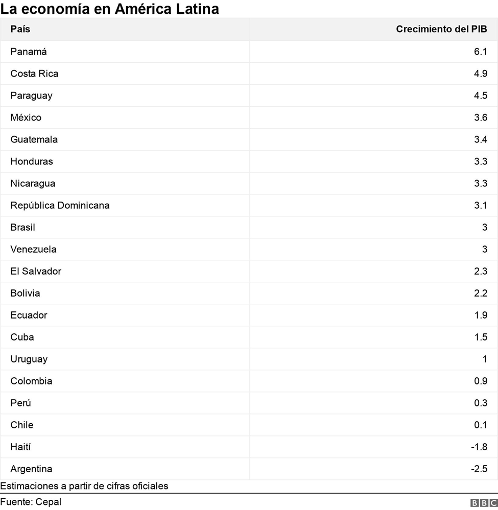 Mientras que los peores datos los tuvieron Argentina, que decreció 2,5% y Haití, que se contrajo en 1,8%. Después de estos, se ubican países que lograron cifras positivas aunque exiguas de crecimiento como Chile (0,1%), Perú (0,3%) y Colombia (0,9%).