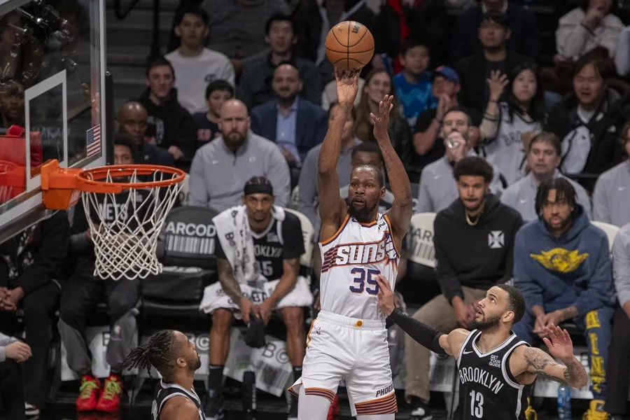 Fotografía de archivo de Kevin Durant (c) de Phoenix Suns lanzando un balón durante un juego de la NBA entre Brooklyn Nets y Phoenix Suns en el Barclays Center en Nueva York (EE.UU.). EFE/ Ángel Colmenares