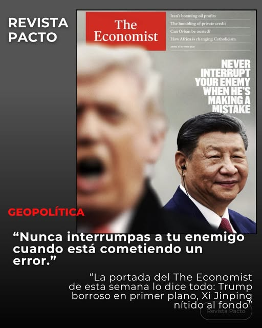 La portada del @TheEconomist de esta semana lo dice todo: Trump borroso en primer plano, Xi Jinping nítido al fondo, sonriendo. El título: «Nunca interrumpas a tu enemigo cuando está cometiendo un error.»