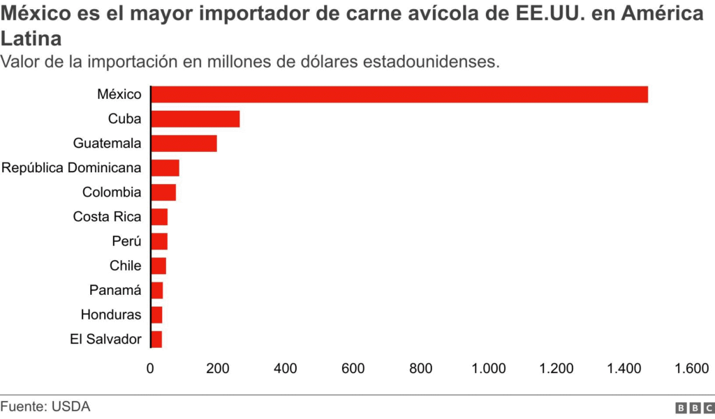 Según las cifras del Departamento de Agricultura de EE.UU. (2024), México es el principal destino no solo en Latinoamérica, sino a nivel mundial, de carne y productos avícolas (excepto los huevos) estadounidenses con importaciones por un valor de unos US$1.500 millones.