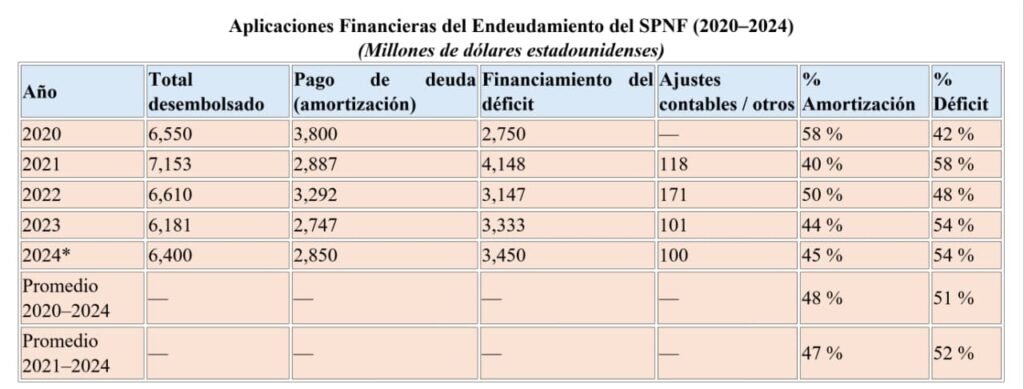 Los informes de la DGCP sobre las aplicaciones financieras del endeudamiento del Sector Público No Financiero (SPNF) muestran que entre 2021 y 2024 la composición del uso de la deuda ha sido prácticamente equitativa entre el financiamiento del déficit fiscal y el pago de deuda previa.