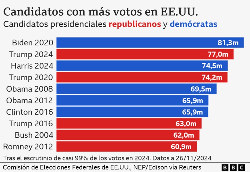 Eso significa que obtuvo más votos que Harris (74,4 millones) o cualquier otro candidato. Ningún republicano ha logrado esa hazaña desde 2004.