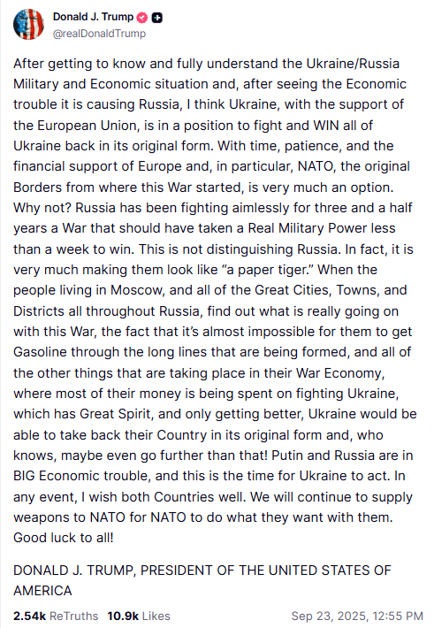 «Ucrania tiene un gran espíritu y cada vez mejor, Ucrania podrá recuperar su país en su forma original y, quién sabe, ¡quizás incluso ir más allá! Putin y Rusia están en graves problemas económicos, y este es el momento de que Ucrania actúe», afirmó el mandatario en la plataforma Truth Social.
