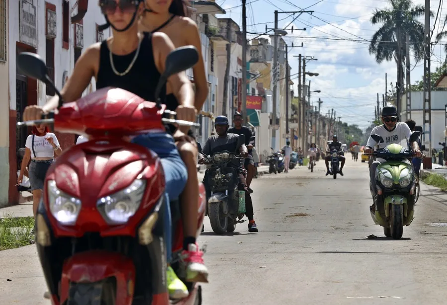 Personas transitan en moto en el poblado de Perico (Cuba). EFE/ Ernesto Mastrascusa